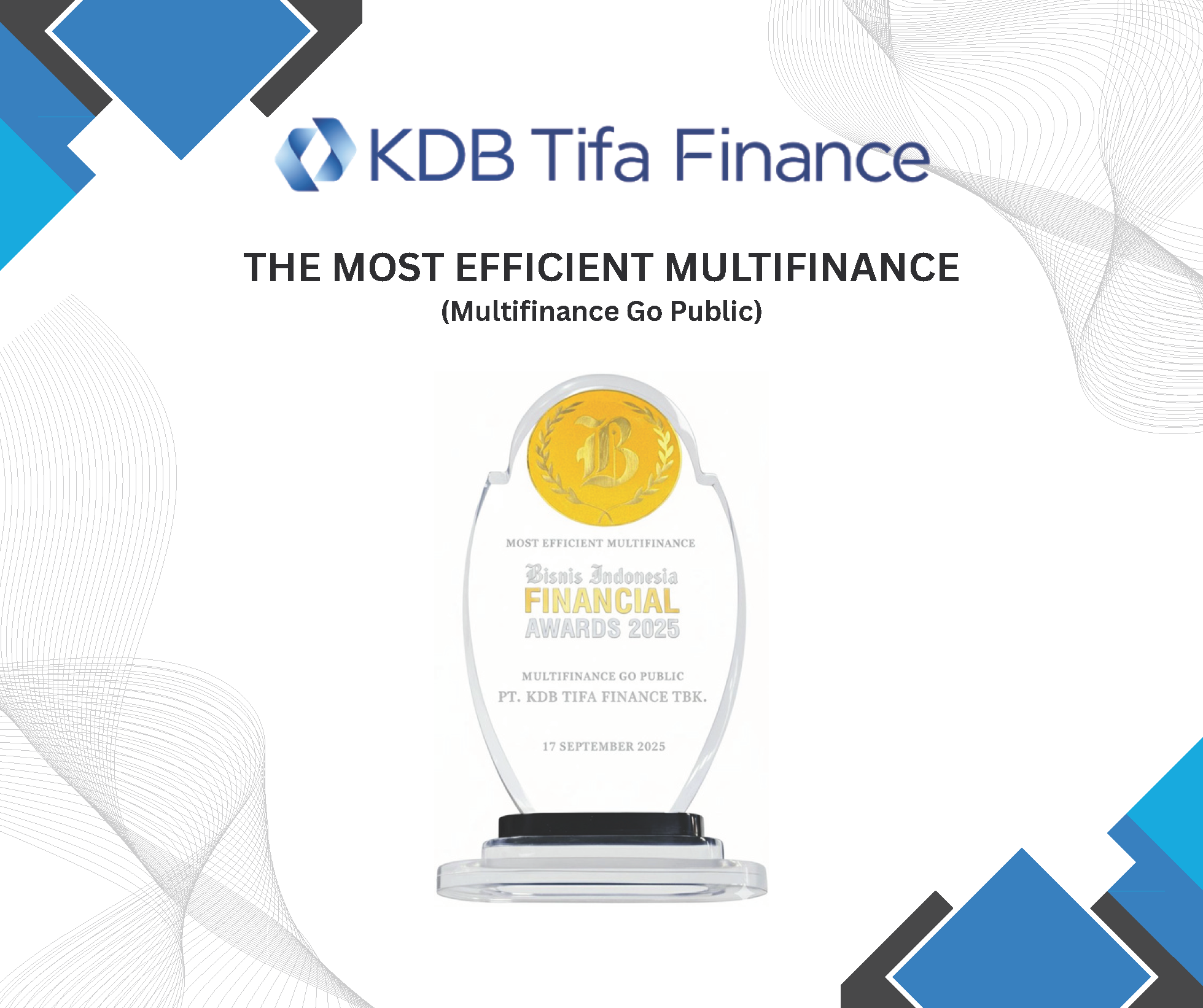 Jakarta – PT KDB Tifa Finance Tbk (“the Company”) was awarded the Most Efficient Multifinance in the Go Public Company category at the 2025 Bisnis Indonesia Financial Awards (BIFA). This 17th annual event was held at the Westin Hotel, Jakarta, on Wednesday (September 17, 2025). BIFA 2025 assessed the performance of multifinance companies through a quantitative selection process based on financial reports, as well as qualitative evaluations by an independent panel of judges consisting of academics, regulators, industry practitioners, and media representatives. This award reflects the Company’s ability to maintain operational efficiency, which has a significant impact on its overall performance. Moreover, it serves as a catalyst for the Company to continue progressing and growing, deliver positive impacts for the broader economy, customers, and stakeholders. Efficiency is the foundation for a company's sustainable performance, aligned with the Company's vision and mission to become a financial platform that leads Indonesia into the future and supports sustainable growth.