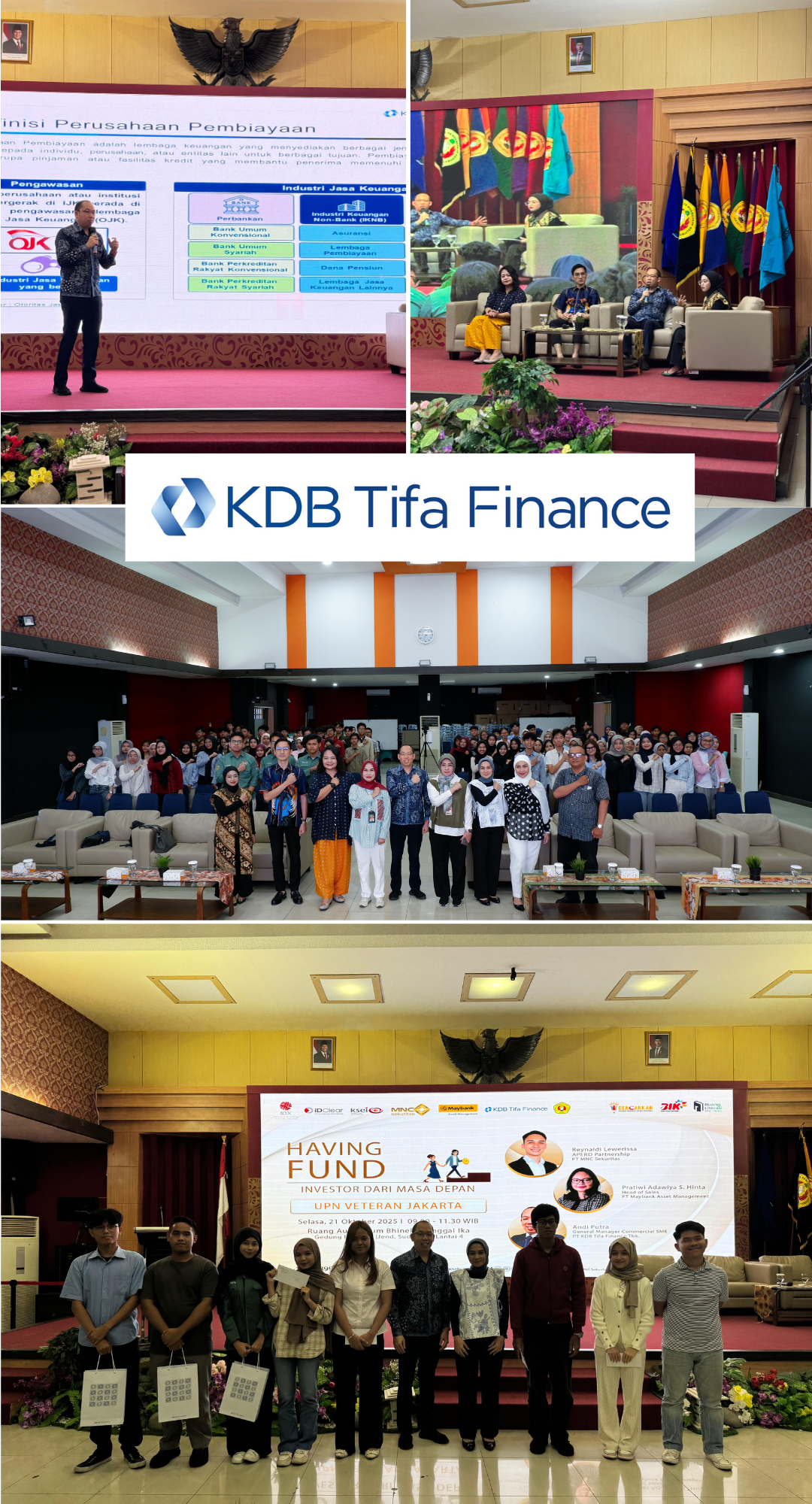 Untuk mendukung dan berpartisipasi dalam program Otoritas Jasa Keuangan (OJK) yang bertujuan meningkatkan literasi keuangan generasi muda Indonesia, PT KDB Tifa Finance Tbk (“Perseroan”) mengadakan kegiatan edukasi literasi keuangan yang berkolaborasi dengan PT MNC Sekuritas, Maybank Asset Management, dan Universitas Pembangunan Nasional Veteran Jakarta. Acara yang digelar pada Selasa, 21 Oktober 2025 di Auditorium Bhinneka Tunggal Ika, UPN Veteran Jakarta, dihadiri oleh 121 mahasiswa dan dosen dari Fakultas Ekonomi dan Bisnis. Kegiatan ini mengusung tema “Have Fund - Investors from the Future”, di mana materi yang disampaikan meliputi pengenalan perusahaan keuangan bagi generasi muda dan pengenalan investasi keuangan. Tema ini bertujuan untuk memberikan gambaran umum tentang perusahaan keuangan, termasuk risiko, hak dan kewajiban konsumen, serta produk-produknya, serta memperkenalkan Perseroan sebagai salah satu emiten dan perusahaan publik di Indonesia. Acara ini berjalan dengan sukses, dengan tanggapan yang antusias dari semua peserta dan pemateri. Di masa depan, Perseroan berharap dapat terus memberikan kontribusi nyata dalam meningkatkan literasi keuangan di Indonesia, yang masih cukup rendah, melalui kolaborasi untuk mencapai hasil yang signifikan.
